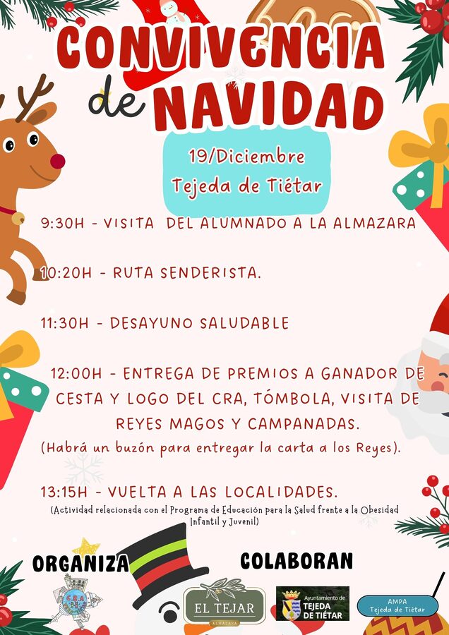 El pasado viernes 19 de diciembre tuvo lugar la convivencia del primer trimestre del CRA. VERA TIÉTAR en la localidad de Tejeda de Tiétar. A lo largo de la mañana se llevaron a cabo actividades en relación al Programa de Educación para la Salud frente a la Obesidad Infantil y Juvenil 2025/2026 al que está adscrito el centro y donde el aceite fue el eje vertebrador del día como producto saludable y cercano al alumnado: